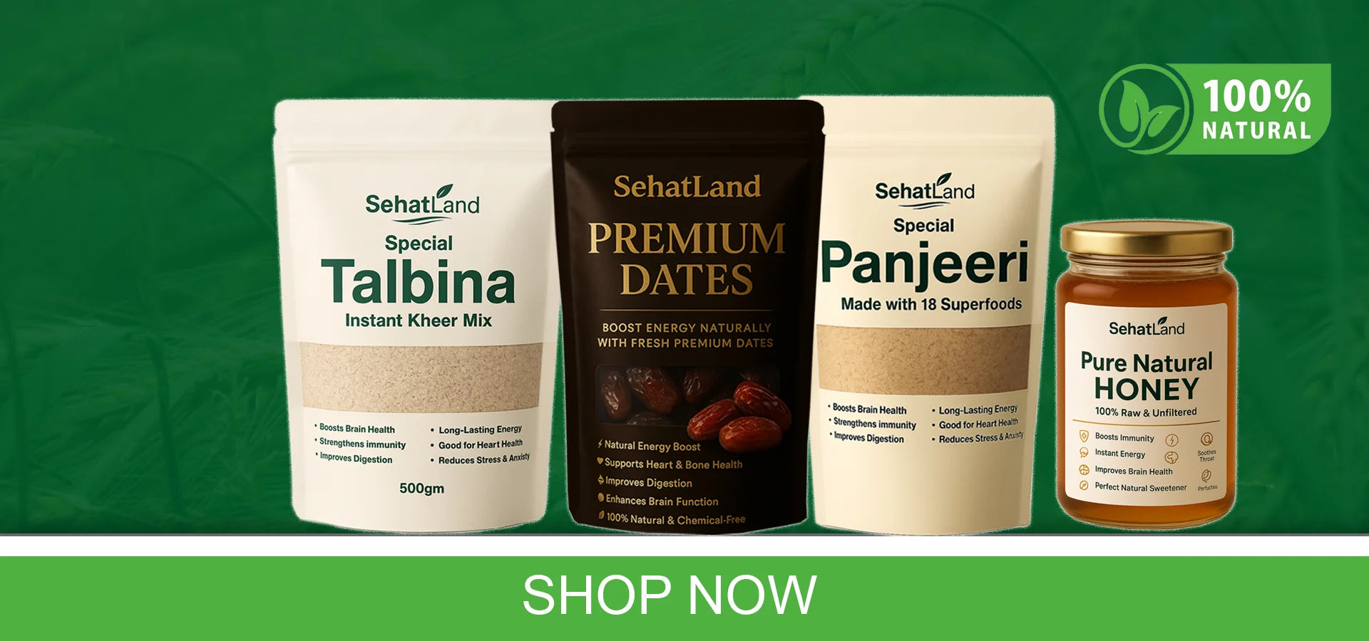At SehatLand, we are dedicated to bringing you pure, natural, and wholesome products inspired by traditional Islamic wellness. From Talbina, Honey, Desi Ghee, Premium Dates and Panjeeri . Every product reflects our commitment to quality, purity, and without any Chemicals. helping you live a healthier, more balanced life, naturally.